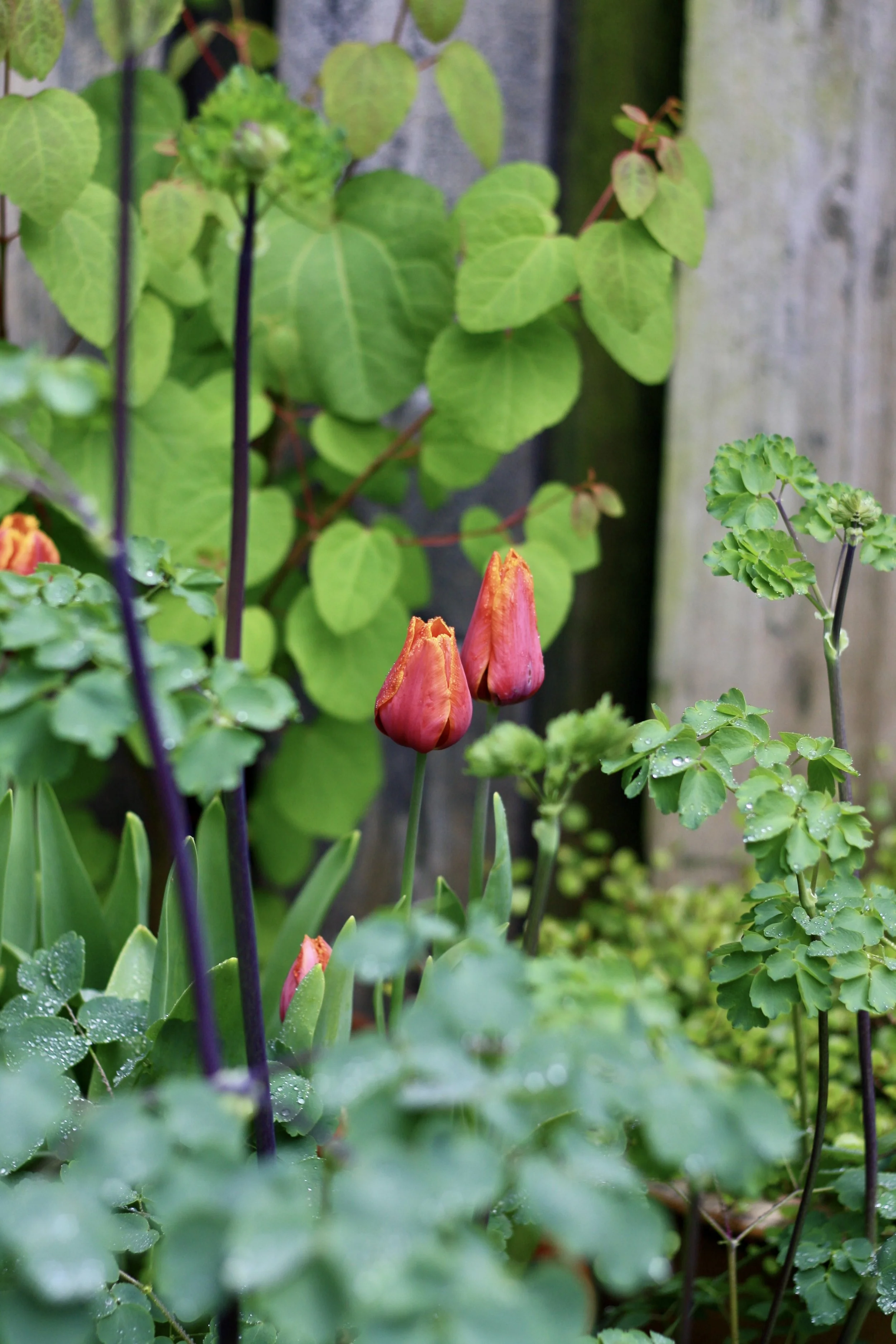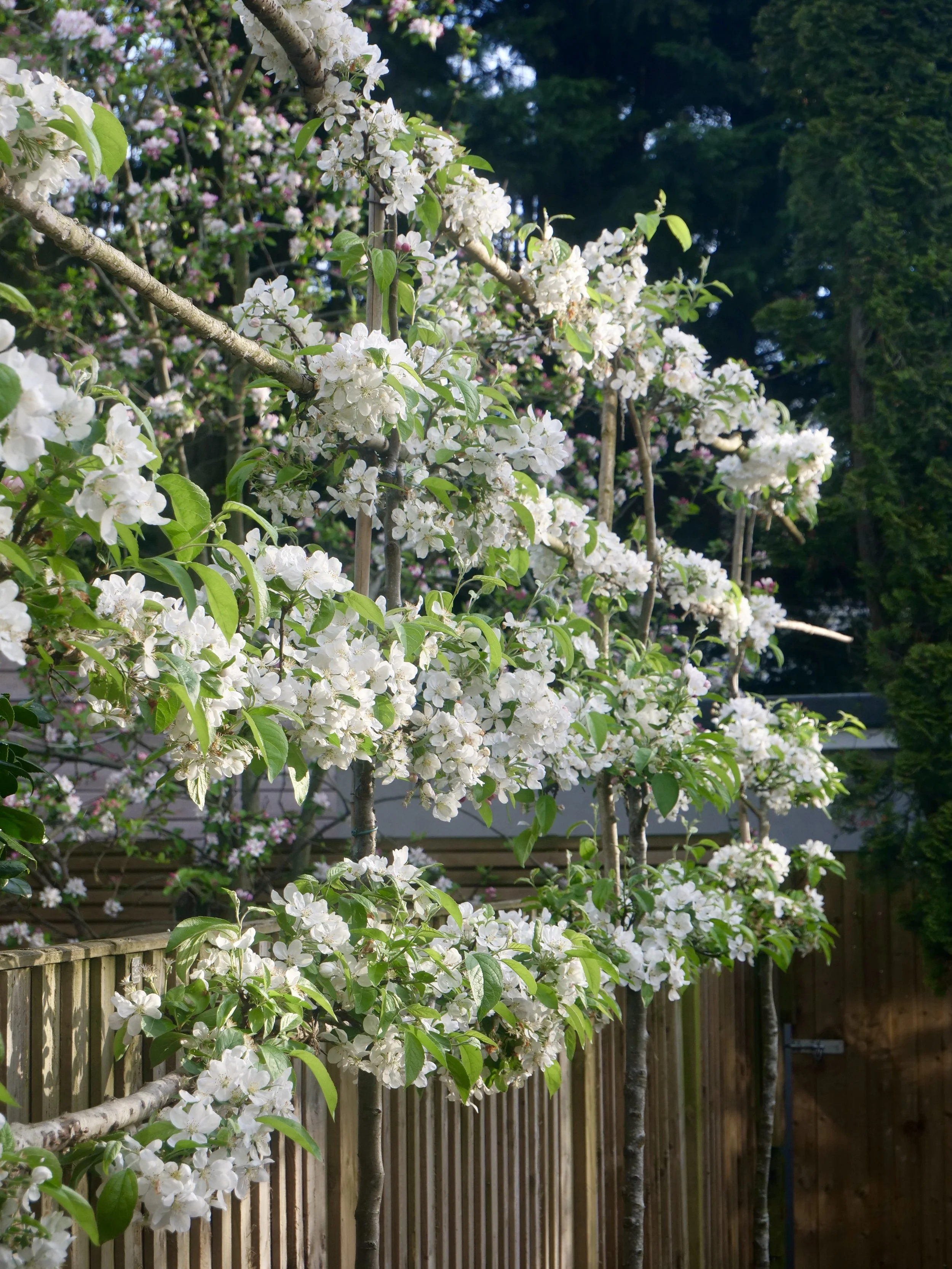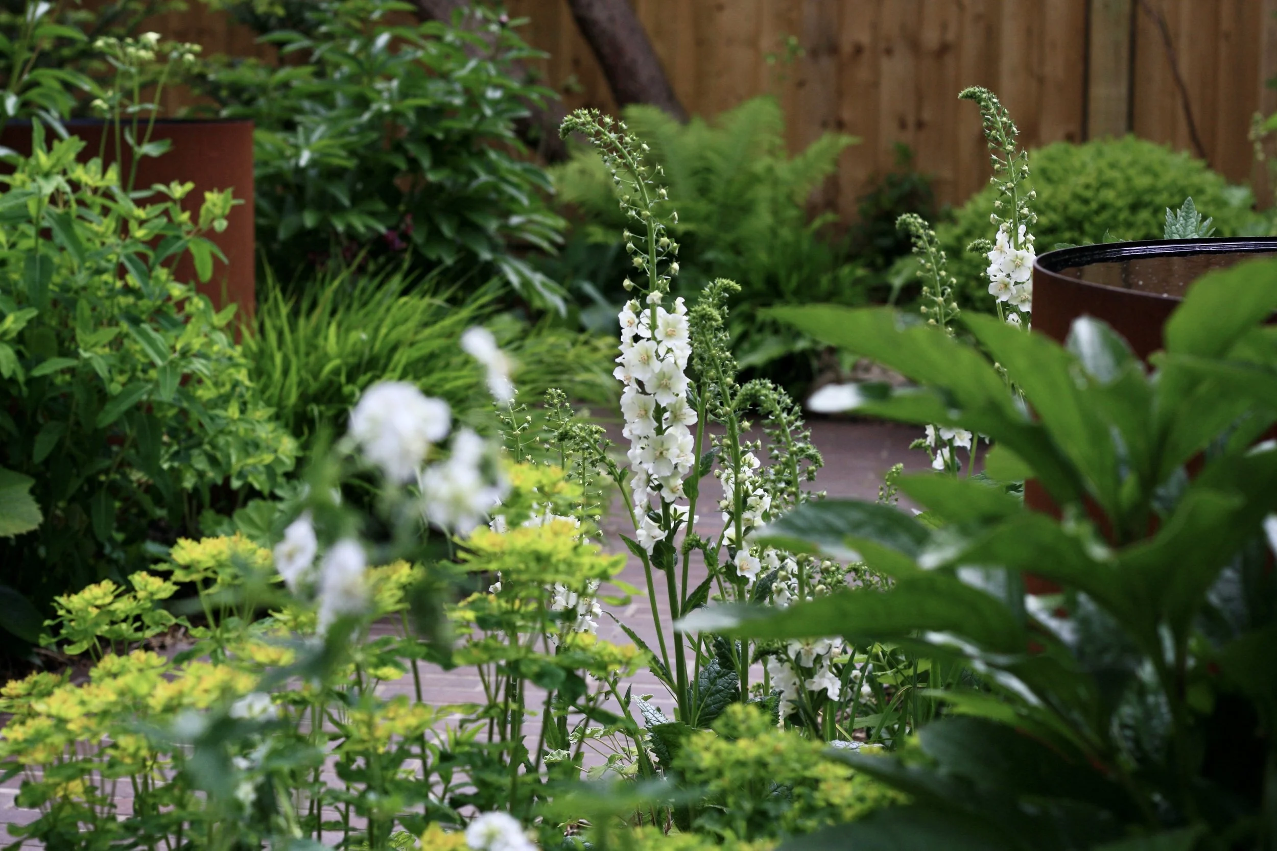Bold architectural elements including yew topiary and pleached crab apples form a permanent structural framework through which softer and wilder herbaceous planting ebbs and flows.